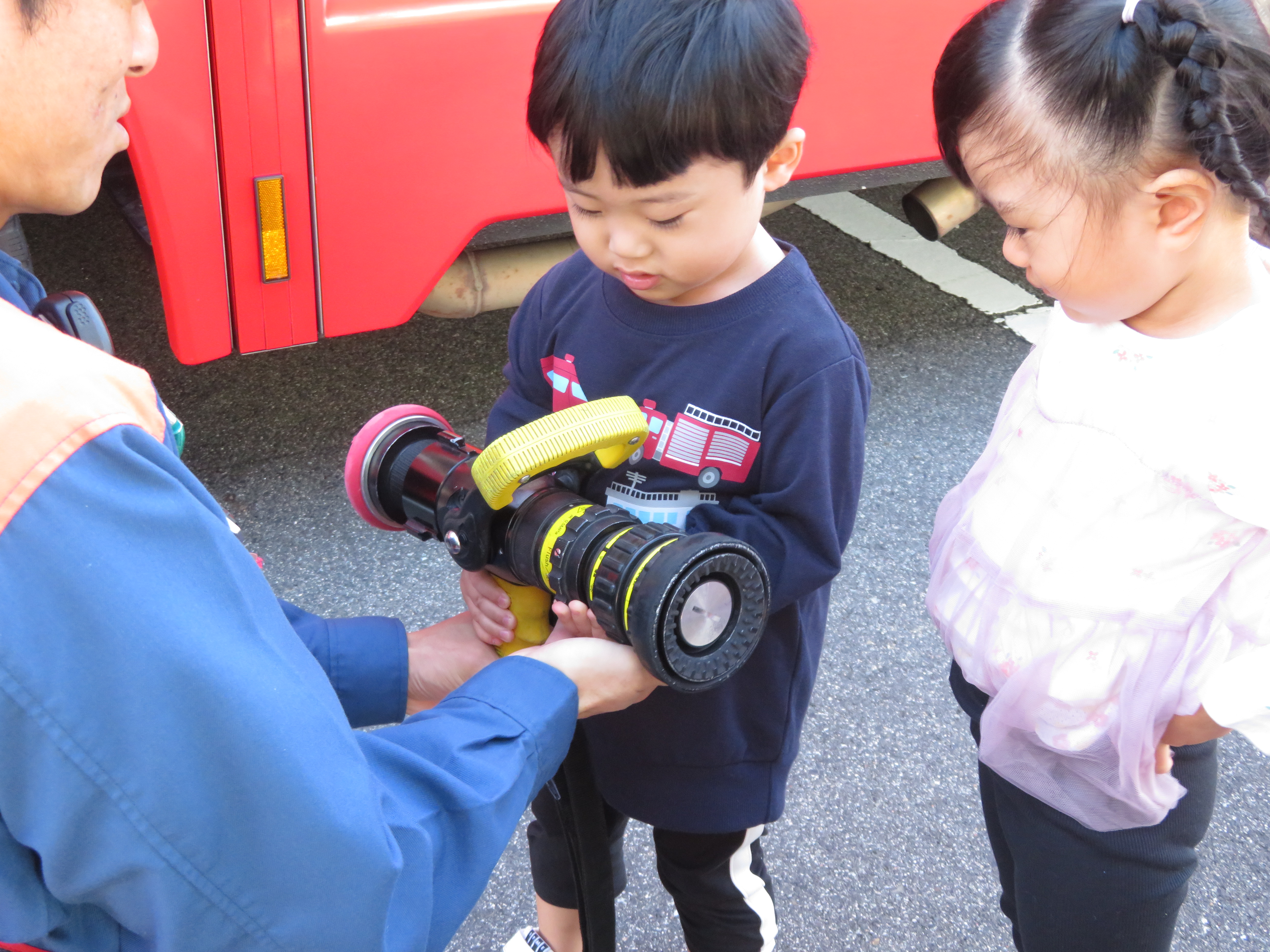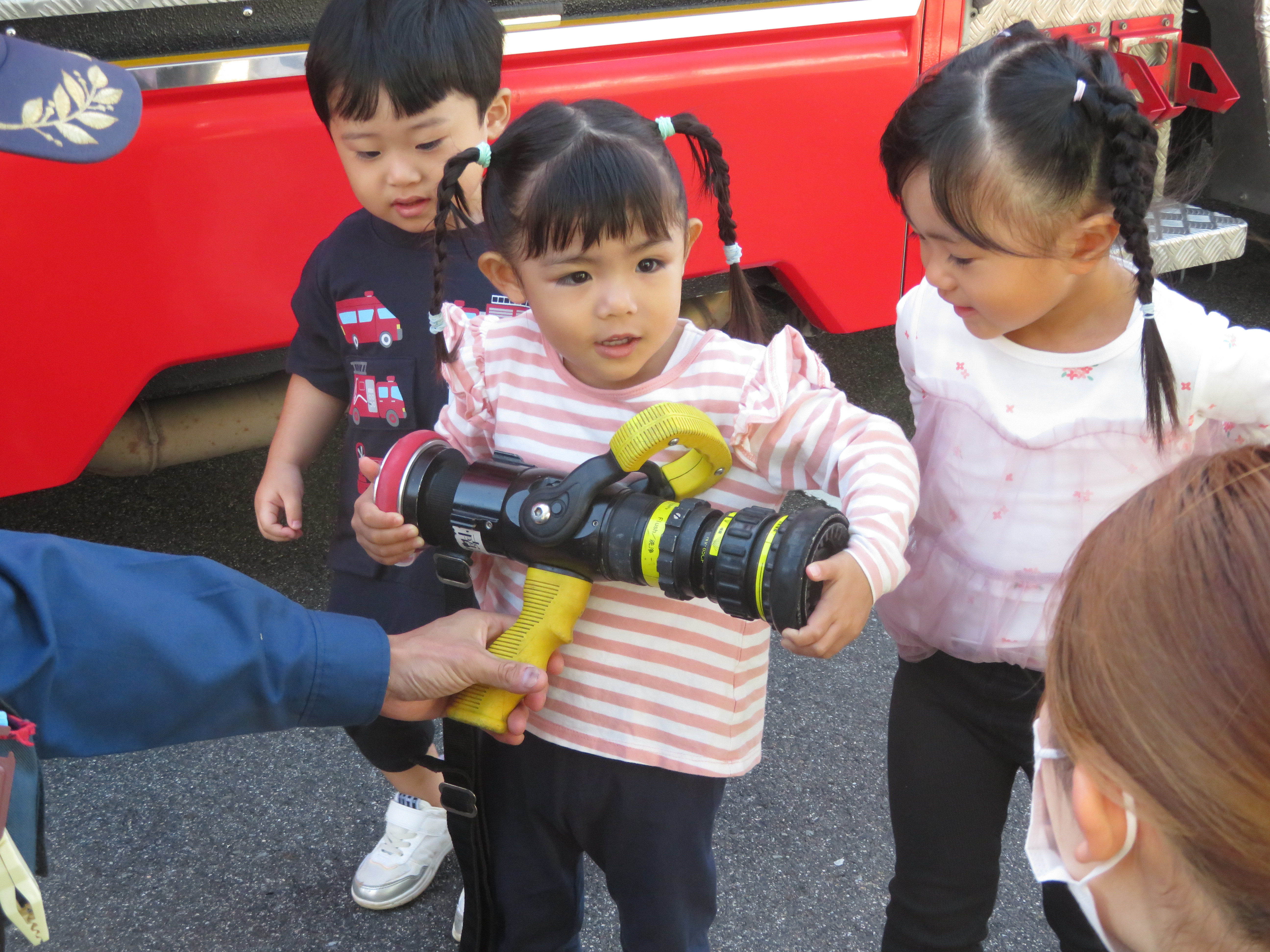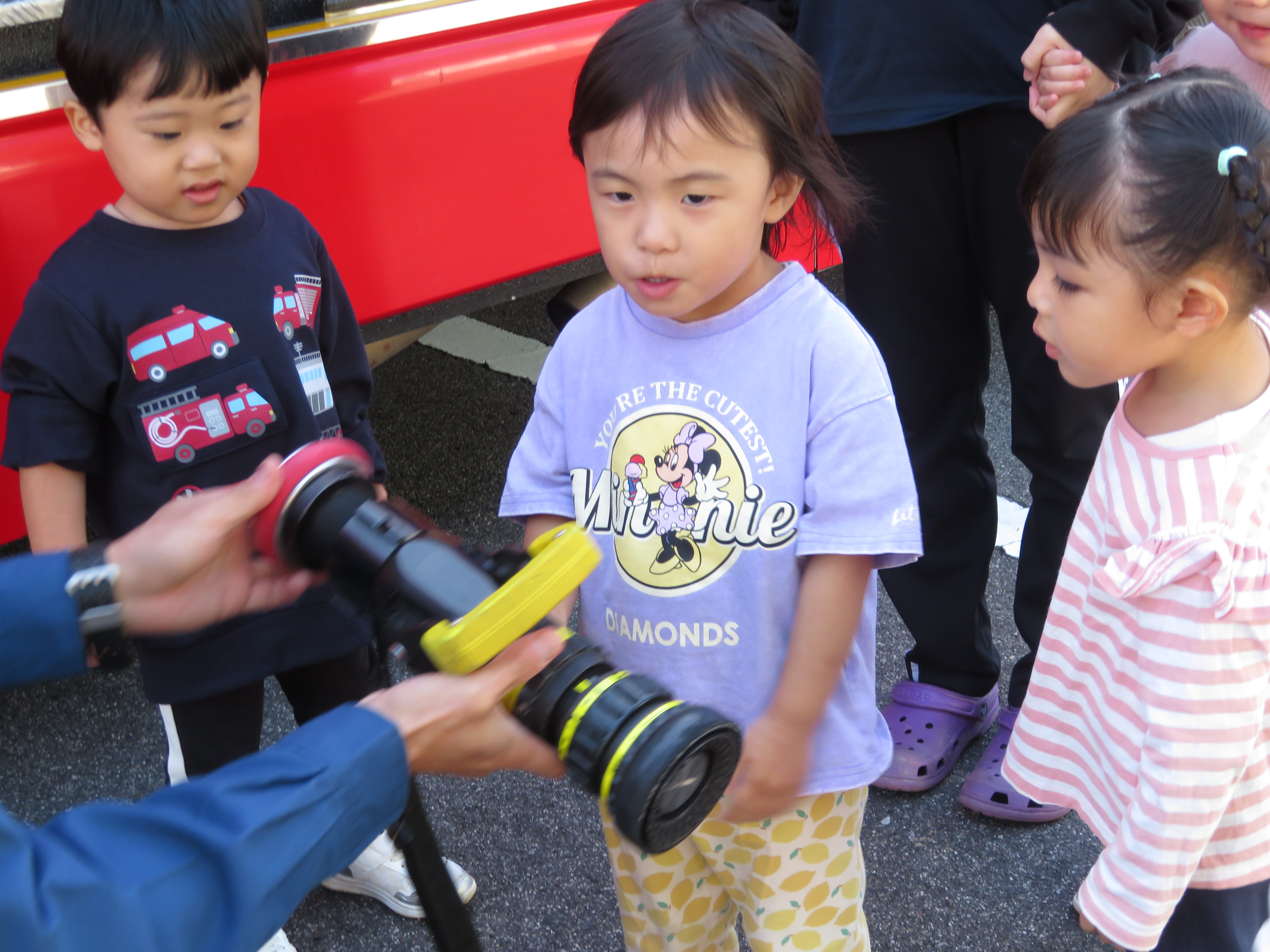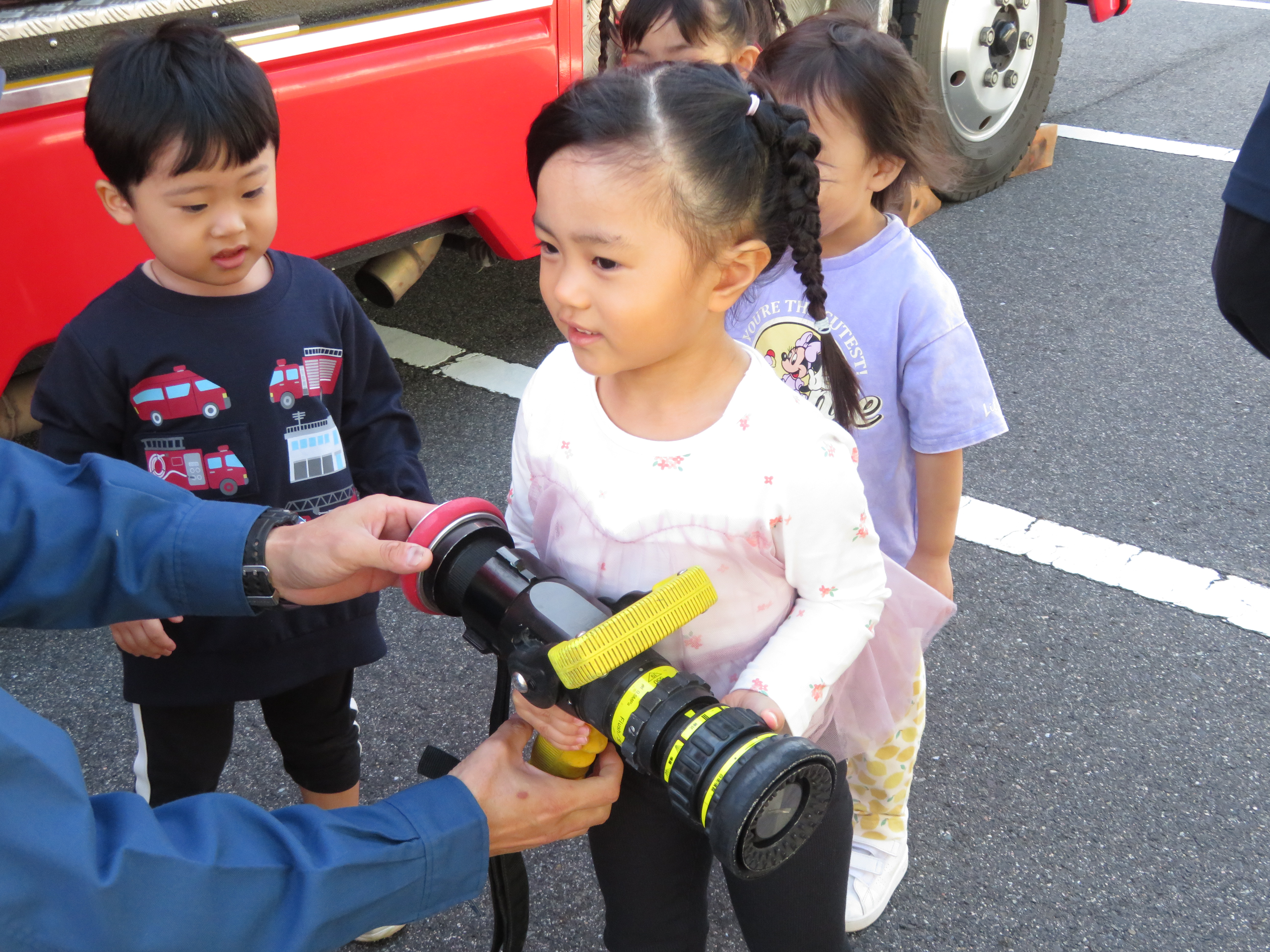 すみれ組のお友だちは、丸まったホースを伸ばすところを見せてもらったり、実際にホースを持たせてもらいました。