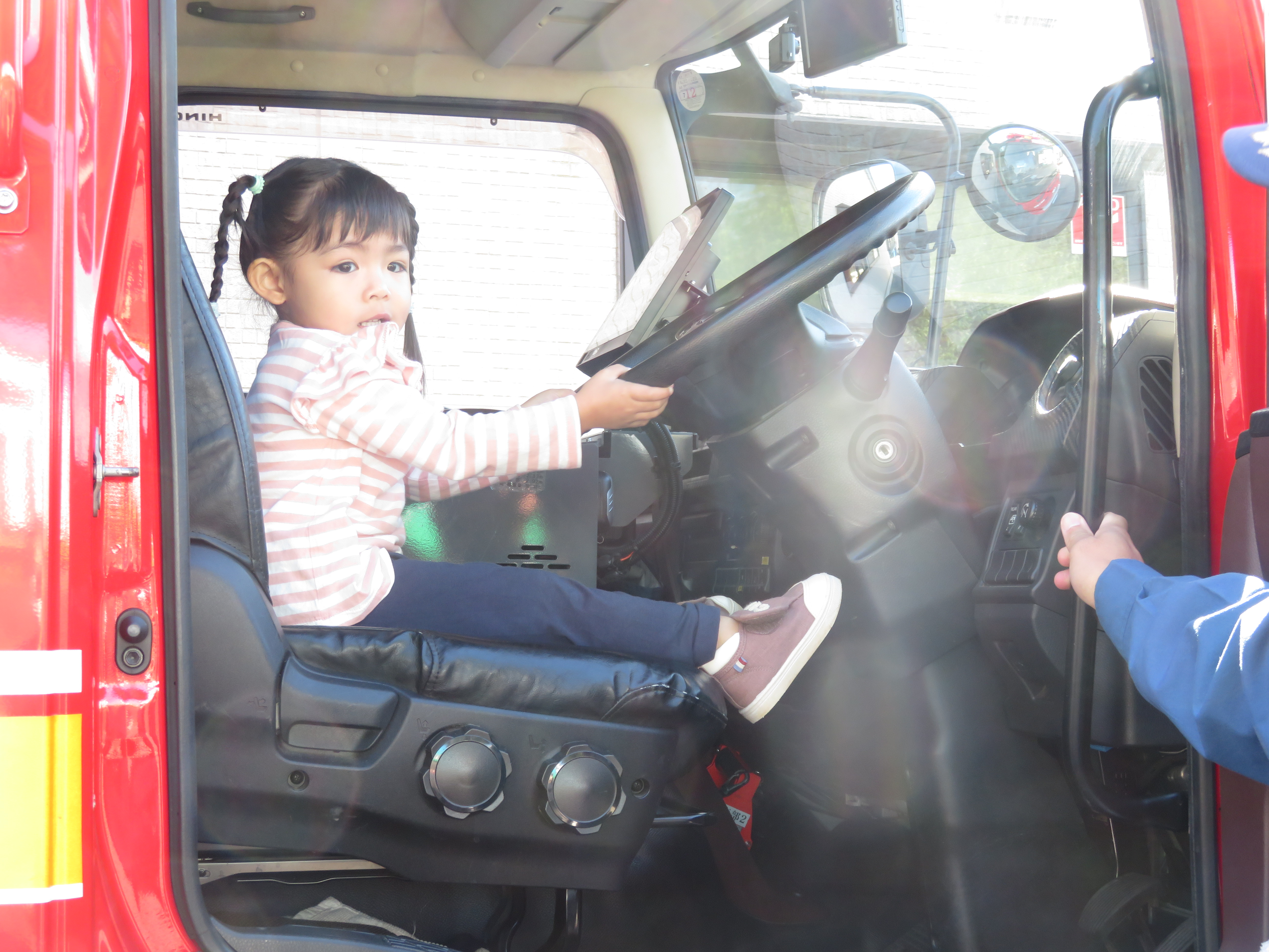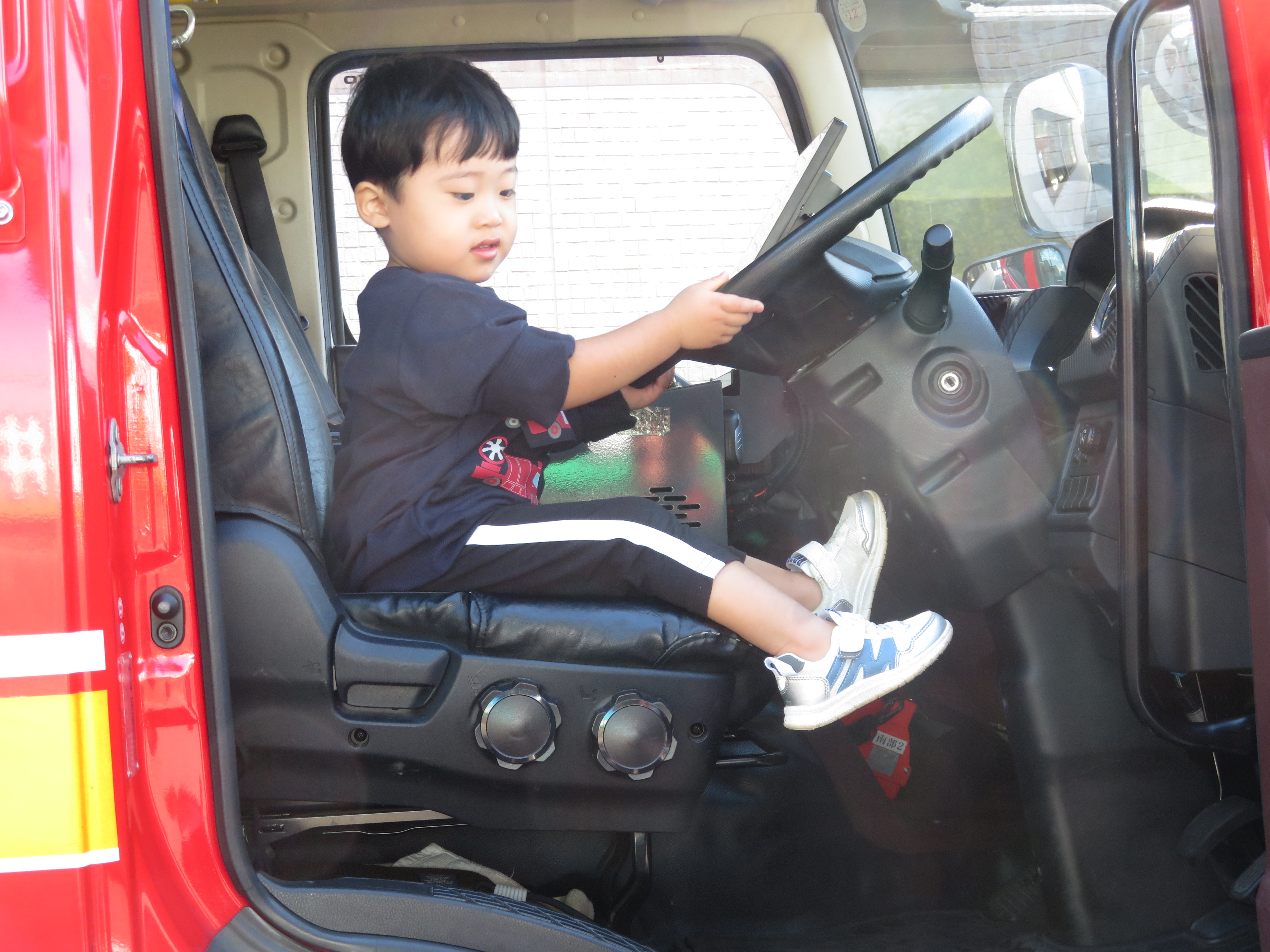 大きな消防車が園舎前に停まると、子どもたちは大喜びです(*^▽^*)